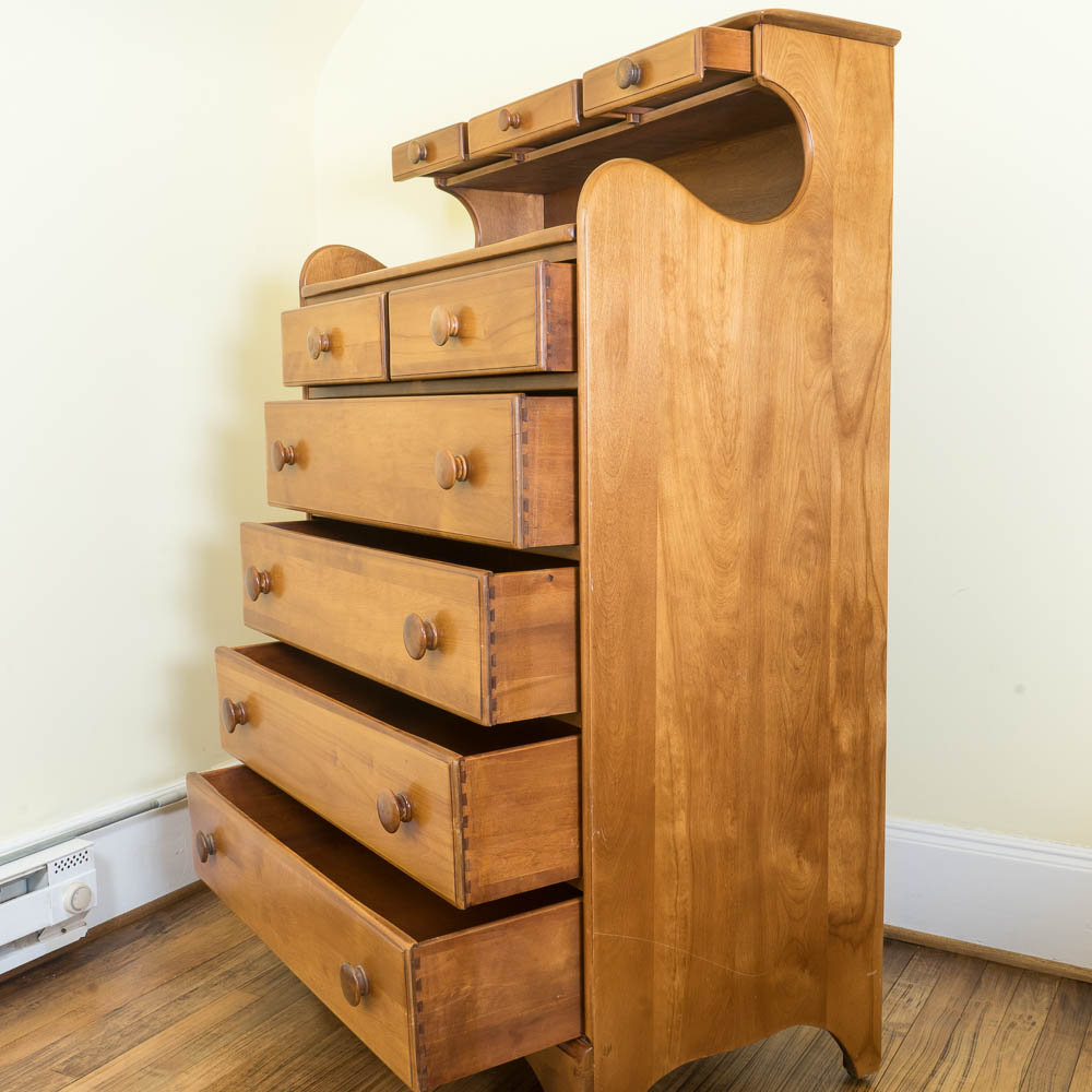 Signed by famous maker, ethan allen, about 25 years ago, a solid maple lingerie chest has seven drawers, one for each day of the week.